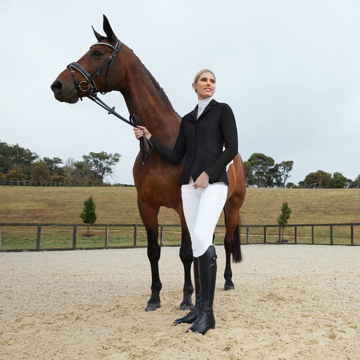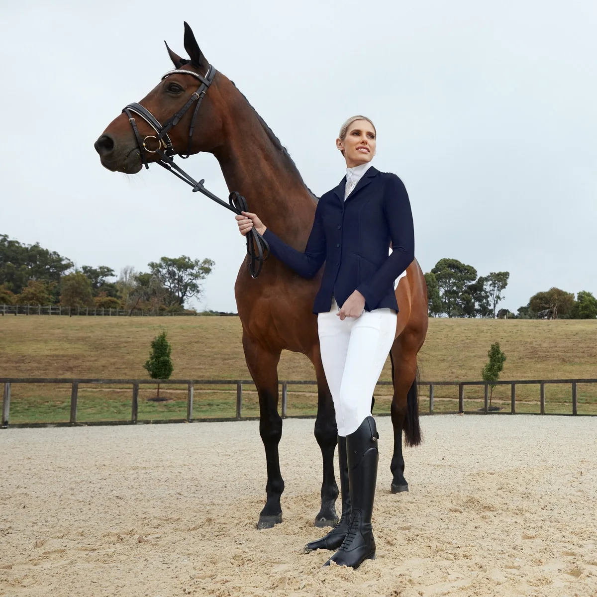 Stretch mesh competition jacket perfect for those hot summer days competing. Flattering princess seam construction. Double vented back. Stylish button details on front & cuffs….