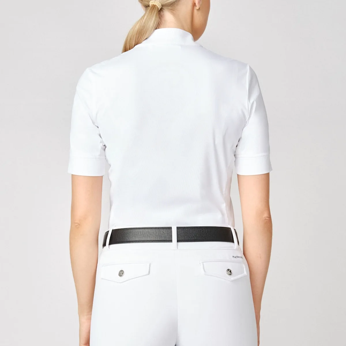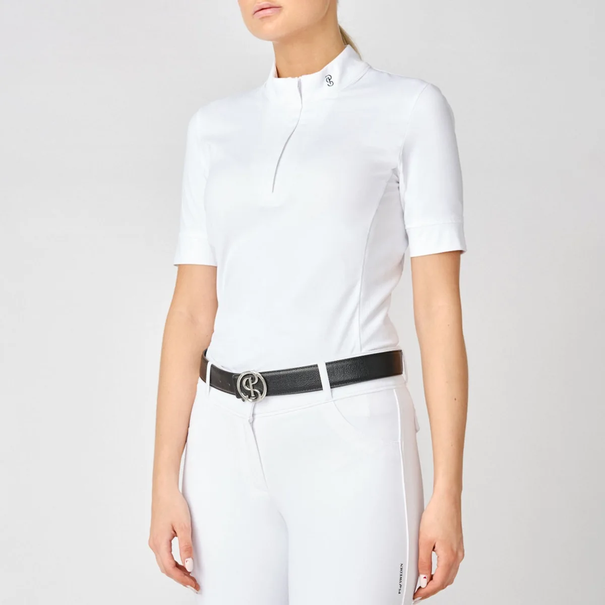 Short sleeve white competition shirt with half-zip, made in a super soft four-way-stretch. The slim fit combined with double mesh panels at the sides, offer optimal comfort under y…